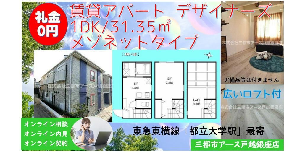 賃料:12.5万円 管理費・共費費:5,000円 敷金:1ヶ月 礼金:0ヶ月 間取り:1DK+ロフト 専有面積:31.35㎡ 築年月:2017年3月 ※定期借家契約