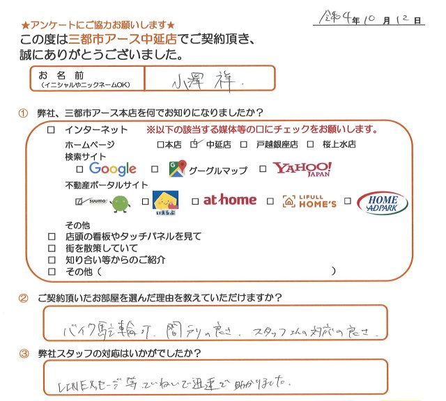 小澤様、この度は三都市アース中延店でお部屋探しのご依頼いただき、誠にありがとうございました。アンケートに写真のご協力ありがとうございました。ご希望条件にあうお部屋がご紹介出来てよかったです。お褒めの言葉、たいへん恐縮です。また何かございましたら、三都市アースをよろしくお願いします。
