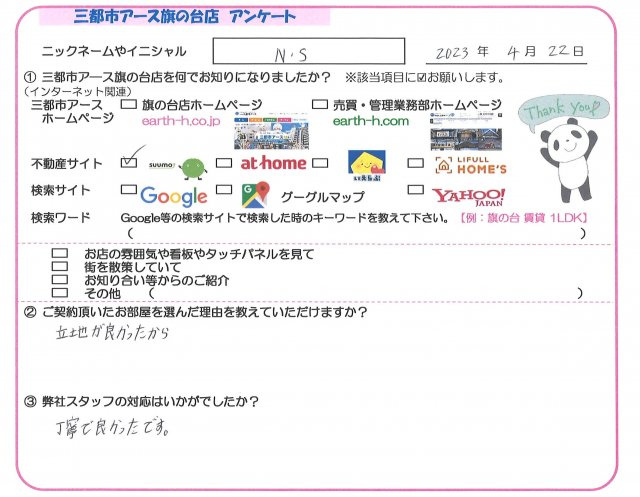 N・S様、この度は三都市ア―ス旗の台店でお部屋探しのご依頼ありがとうございました。ご希望に添えるお部屋がご紹介できてよかったです。アンケートに写真のご協力とクチコミもありがとうございました。また何かございましたら、東京都内や近隣県のご紹介が可能ですので三都市ア―ス旗の台店をよろしくお願いします。