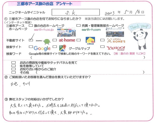S.K.様、この度は三都市ア―ス旗の台店でお部屋探しのご依頼ありがとうございました。アンケートに写真のご協力もありがとうございます。こだわり大事ですね!ご希望にあうお部屋がご紹介できてよかったです。また何かございましたら、東京都内や近隣県のご紹介が可能ですので、三都市ア―ス旗の台店をよろしくお願いします。