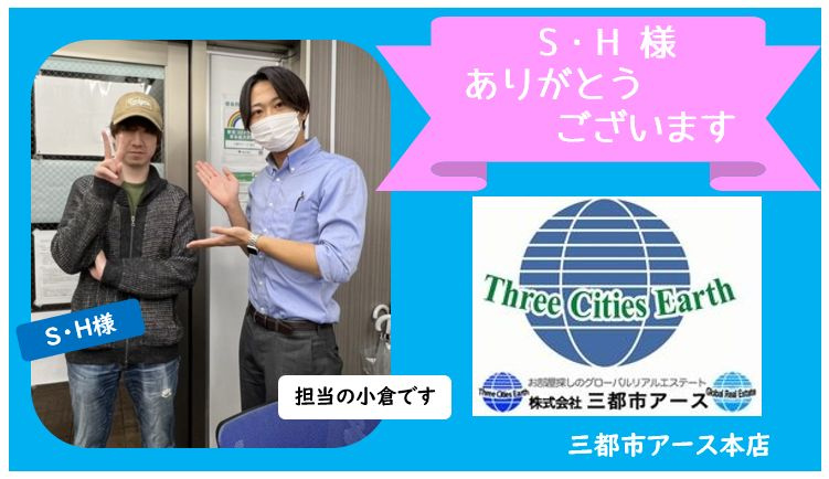 S・H様、この度は三都市アース本店でお部屋探しのご依頼ありがとうございます。ご紹介して頂いた方にもお礼申し上げます。アンケ―トと写真のご協力もありがとうございました。また何かございましたら、三都市アース本店をよろしくお願いします。