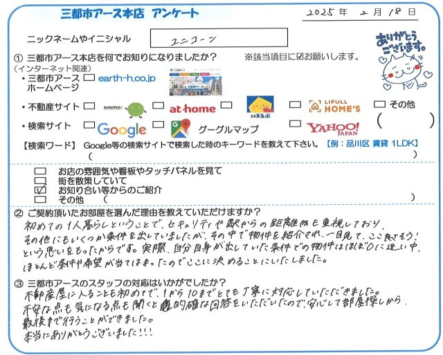 ユニコーン様、この度は三都市アース本店でお部屋探しのご依頼ありがとうございます。初めてのお部屋探し、不動産屋さんという事で分からない事、不安な事も多かったと思いますが、ご希望に合うお部屋がご紹介できて良かったです。お褒めの言葉もありがとうございます。また何かございましたら三都市アース本店をよろしくお願いします。