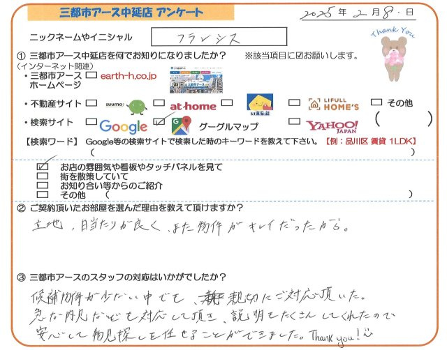 フランシス様、この度は三都市アース中延店でお部屋が志のご依頼ありがとうございます。ご希望に添えるお部屋がご紹介出来て良かったです。安心して任せていただけたようで嬉しいです。また何かございましたら三都市アース中延店をよろしくお願いします。