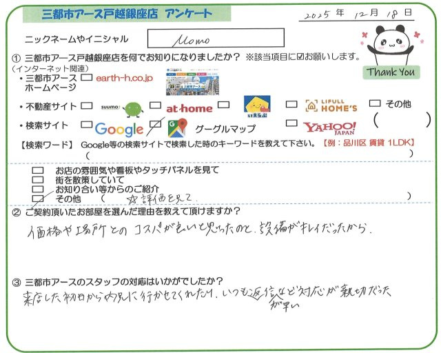 中延・戸越銀座・旗の台の賃貸・売買・管理は三都市アース(さんとしアース) > お客様の声一覧 > Momo様