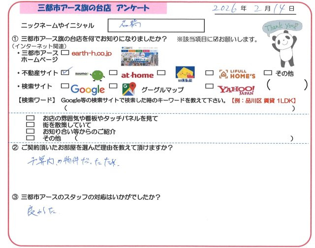 石橋様、この度は三都市アース旗の台店でお部屋探しのご依頼ありがとうございます。ご希望予算に合うお部屋がご紹介出来て良かったです。また何かございましたら三都市アース旗の台店をよろしくお願いします。